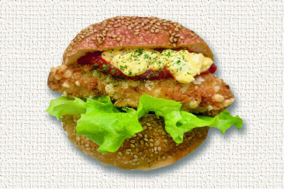 トマトガーリックの酸味とたまごサラダのコクがササミ揚げの旨味を引き立てます!食べ応え抜群の彩りバーガー♪