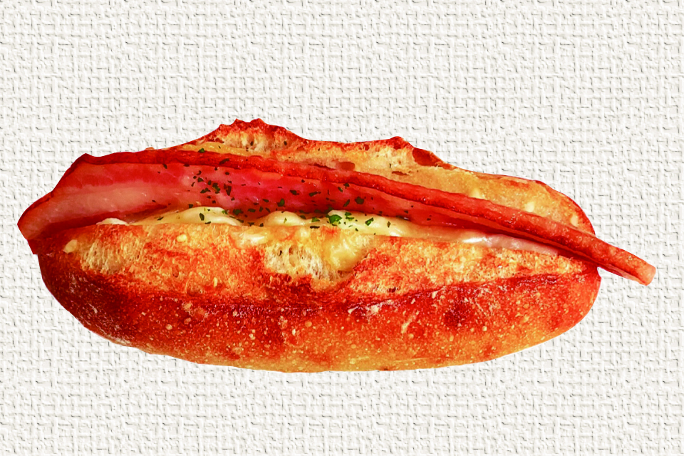 パリパリのフランスパンにコロコロベーコンと2種類のチーズを包みました!