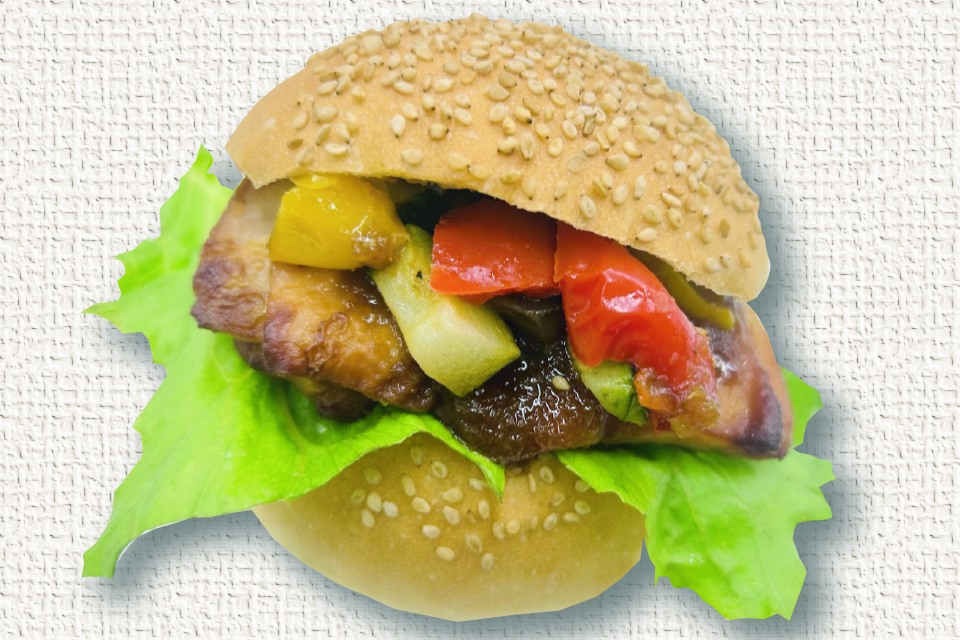 彩り野菜とチキンステーキをバーガーにサンドし、柚子醤油ドレッシングで味付けました!